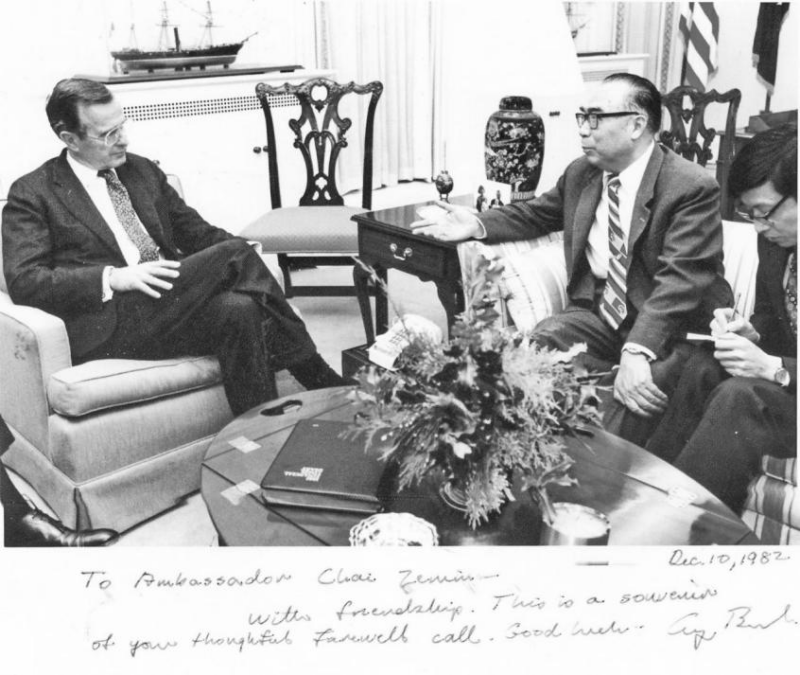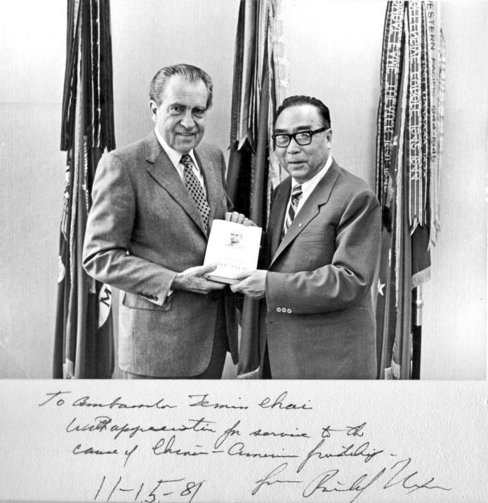 1981年11月15日,柴泽民(右)与尼克松合影。照片下面为尼克松签字