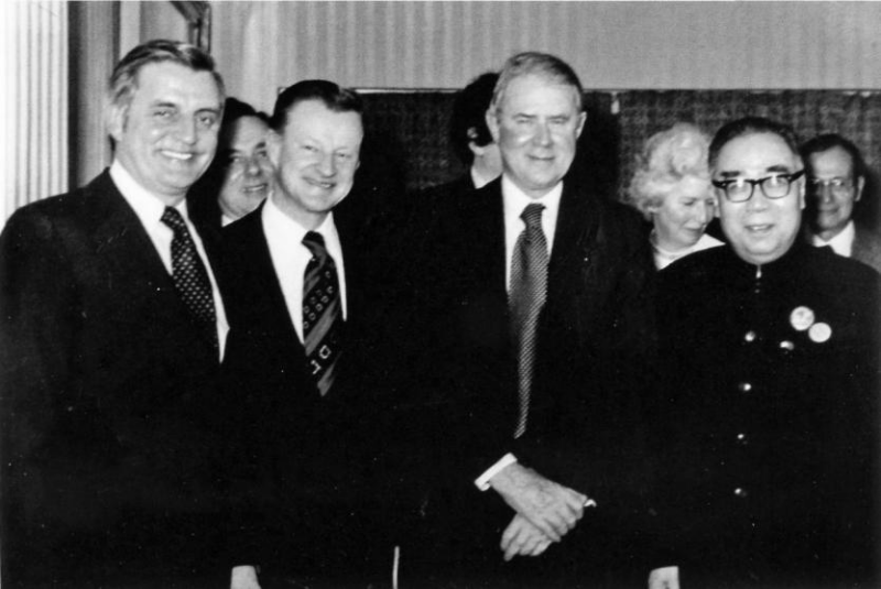 柴泽民(右一)与美国国务卿万斯(右二)、副总统蒙代尔(左一)合影